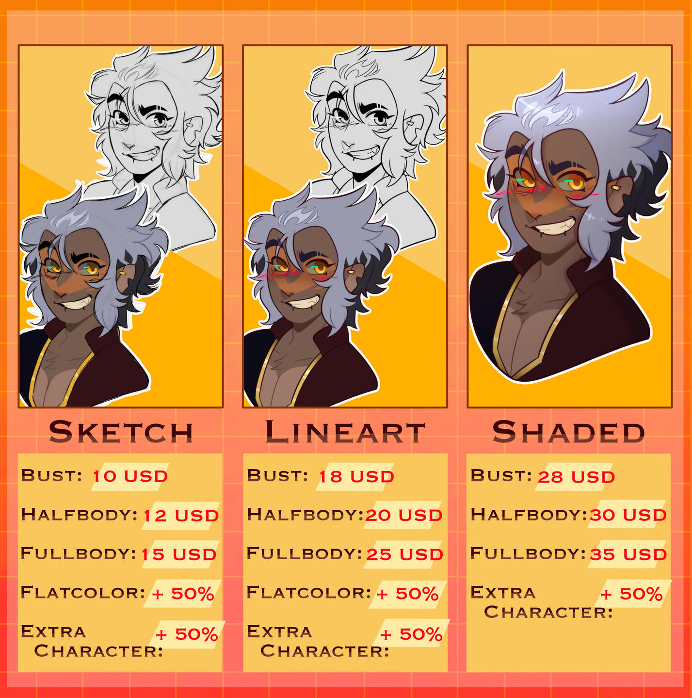 - Commissions are free to be used for personal use such as PFPs, banners, server stickers/emotes, etc. They however may NOT be used for monetary gain such as merchandise unless previously discussed and agreed upon, prices for these types of commissions will be higher than normal commissions.