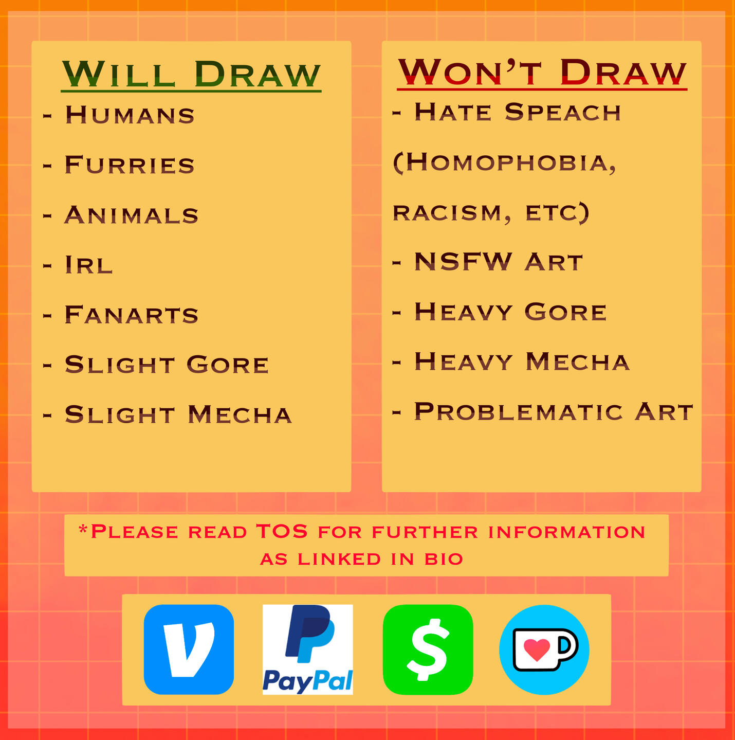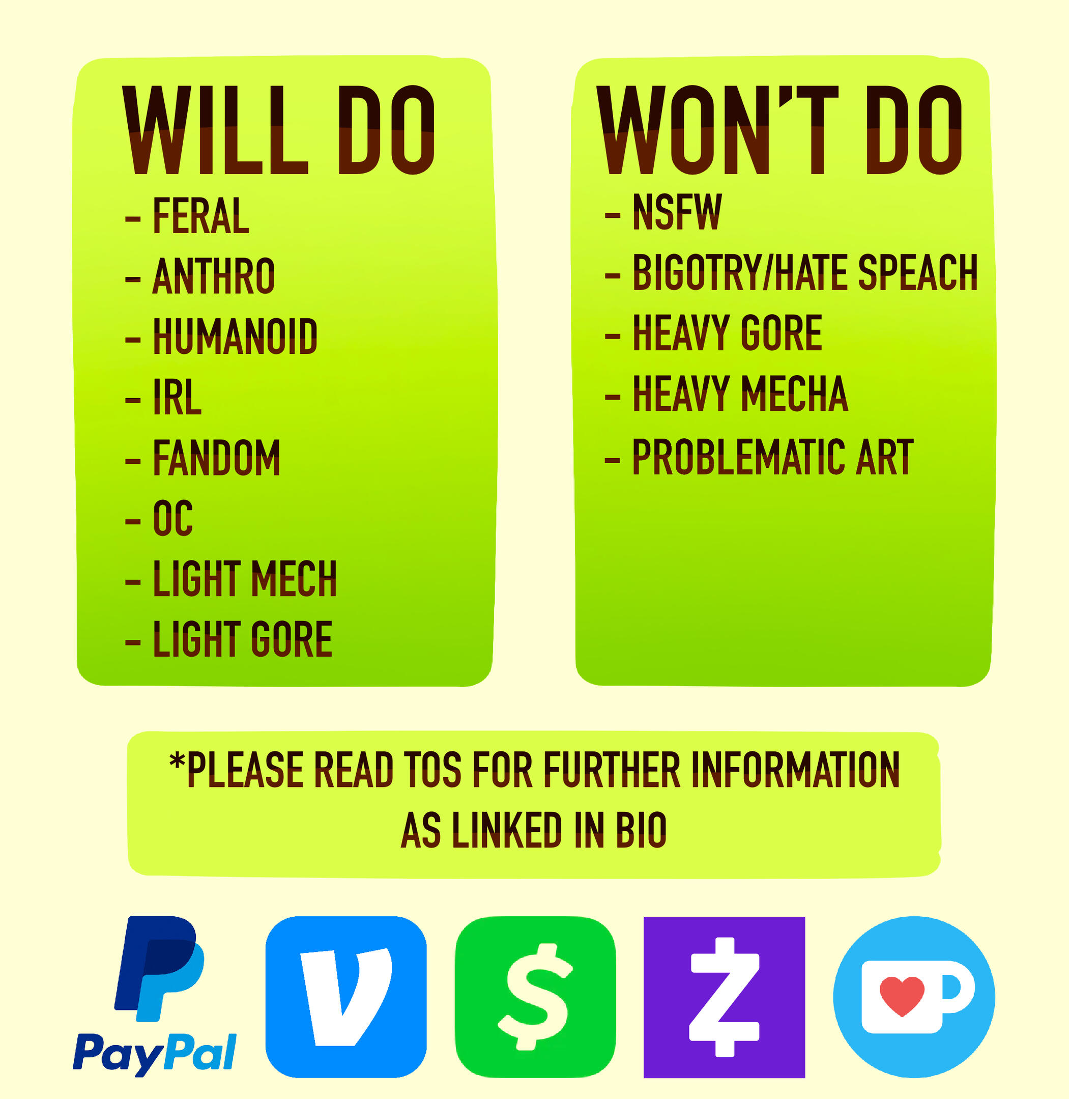 - Payments may be made through Venmo, Cash App, Ko-Fi, Zelle, or PayPal